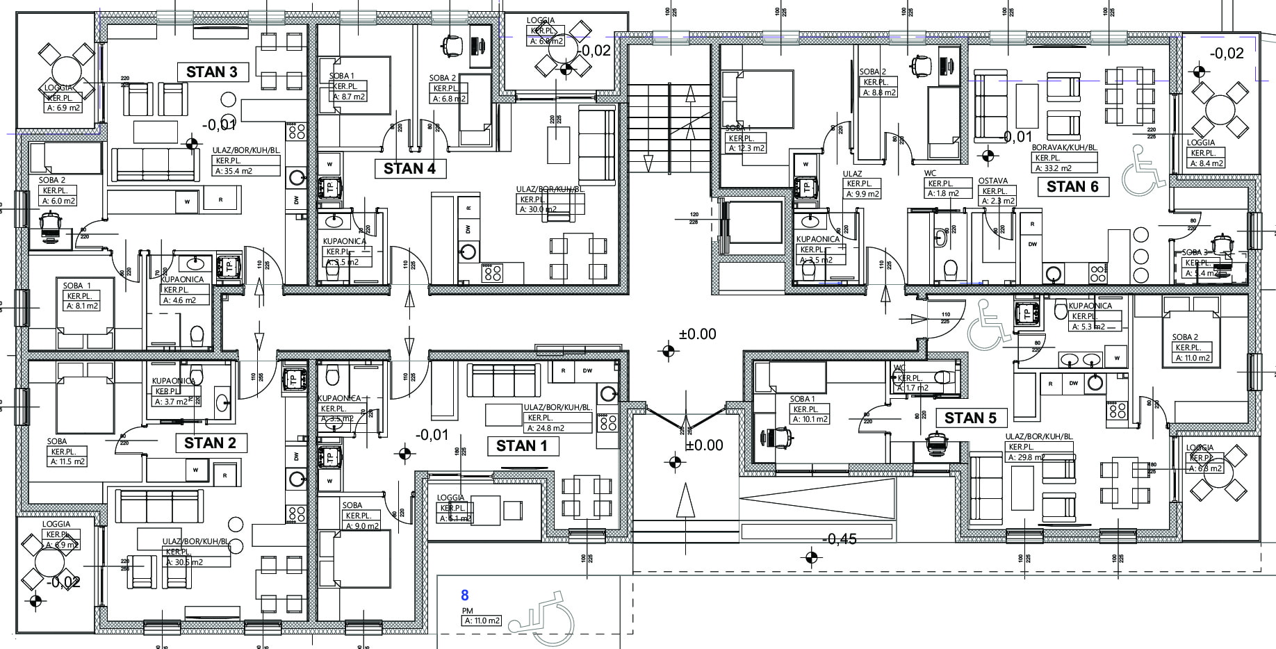 Parcela ima izravan pristup s javno-prometne površine – ulica Hrvatske mladeži - k.č. br. 4095, k.o Zaprešić, s koje je organiziran i kolni i pješački pristup. Projektirana stambena građevina je nepravilnog tlocrta : zajednička podzemna garaža je unutar gabarita 45,10×57,65 m, zgrada 1 unutar gabarita 34,00x17,00 m, a zgrada 2 unutar gabarita 25,80x17,00 m. Katnost građevine je Pod+Pr+2+UK. Apsolutna nula +/-0,00 (pod prizemlja) izvest će se na 128,73 mnv prema geodetskoj snimci. Vrh atike nalazi se na koti cca 12,92 m iznad poda prizemlja. Pod prizemlja je na +0,45 m od pristupnog nogostupa, a pod podrumske etaže je na -3,15 m od poda prizemlja.