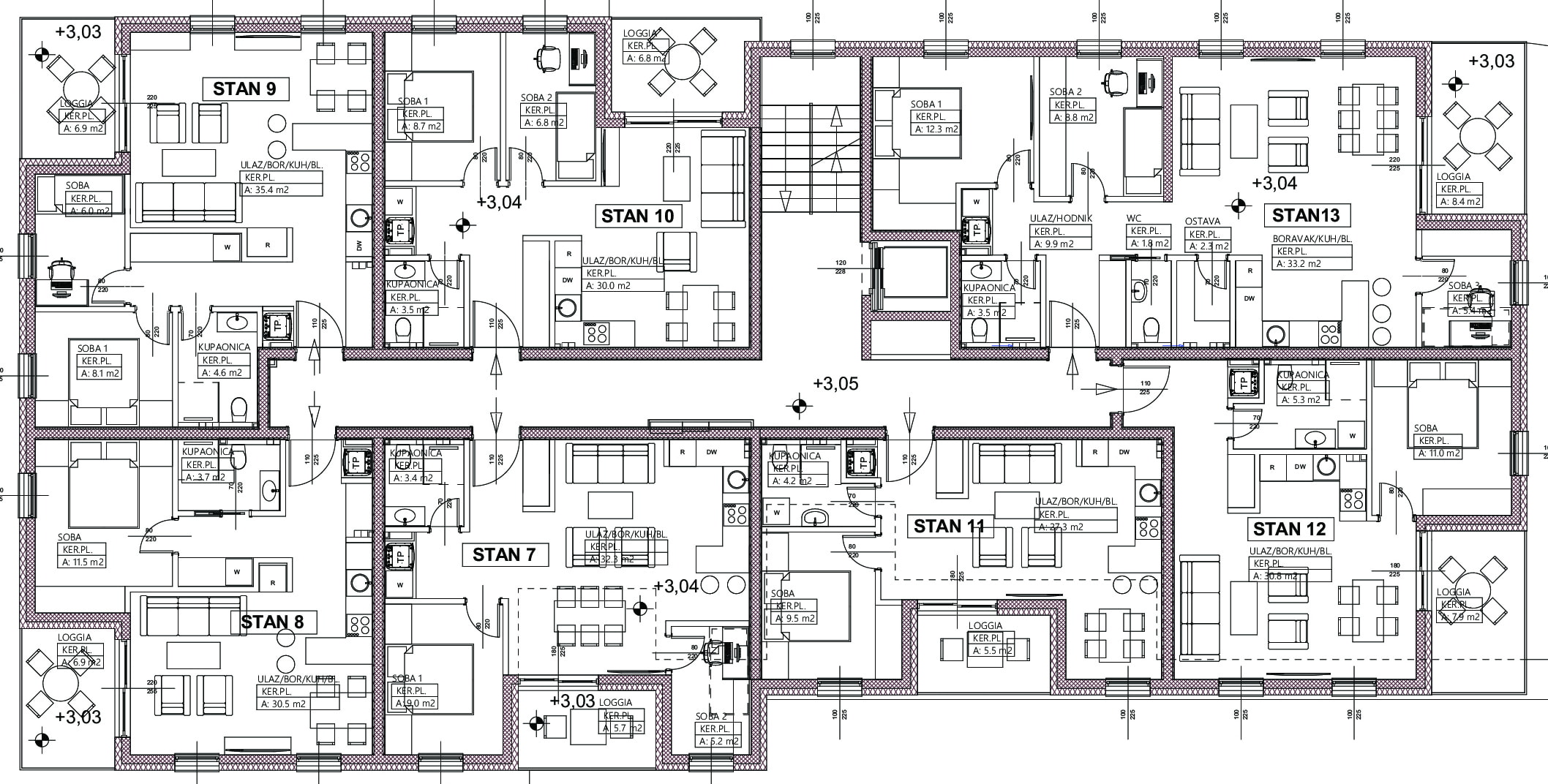 Parcela ima izravan pristup s javno-prometne površine – ulica Hrvatske mladeži - k.č. br. 4095, k.o Zaprešić, s koje je organiziran i kolni i pješački pristup. Projektirana stambena građevina je nepravilnog tlocrta : zajednička podzemna garaža je unutar gabarita 45,10×57,65 m, zgrada 1 unutar gabarita 34,00x17,00 m, a zgrada 2 unutar gabarita 25,80x17,00 m. Katnost građevine je Pod+Pr+2+UK. Apsolutna nula +/-0,00 (pod prizemlja) izvest će se na 128,73 mnv prema geodetskoj snimci. Vrh atike nalazi se na koti cca 12,92 m iznad poda prizemlja. Pod prizemlja je na +0,45 m od pristupnog nogostupa, a pod podrumske etaže je na -3,15 m od poda prizemlja.