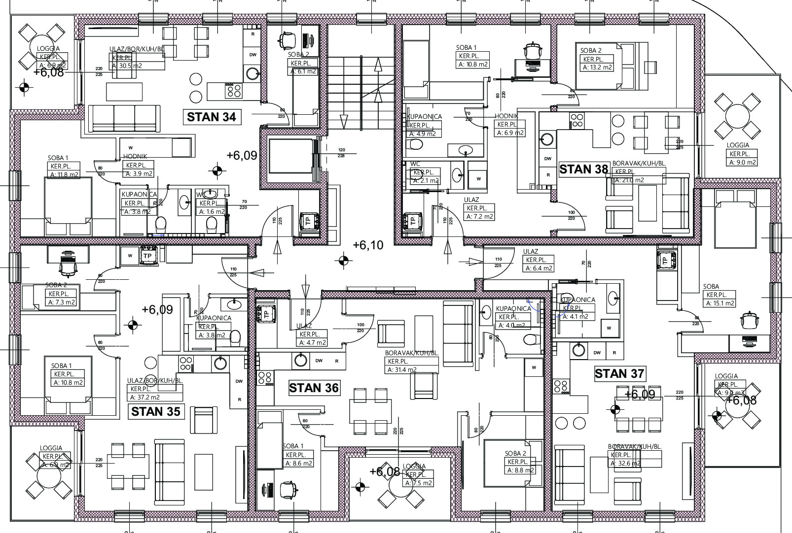Parcela ima izravan pristup s javno-prometne površine – ulica Hrvatske mladeži - k.č. br. 4095, k.o Zaprešić, s koje je organiziran i kolni i pješački pristup. Projektirana stambena građevina je nepravilnog tlocrta : zajednička podzemna garaža je unutar gabarita 45,10×57,65 m, zgrada 1 unutar gabarita 34,00x17,00 m, a zgrada 2 unutar gabarita 25,80x17,00 m. Katnost građevine je Pod+Pr+2+UK. Apsolutna nula +/-0,00 (pod prizemlja) izvest će se na 128,73 mnv prema geodetskoj snimci. Vrh atike nalazi se na koti cca 12,92 m iznad poda prizemlja. Pod prizemlja je na +0,45 m od pristupnog nogostupa, a pod podrumske etaže je na -3,15 m od poda prizemlja.